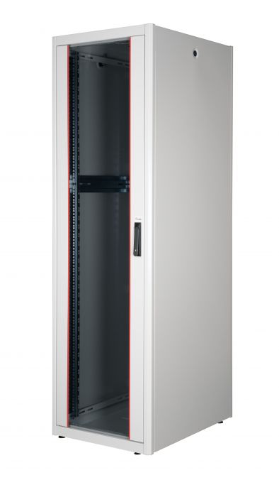 • These cabinets, of the Basic Flex Line, are engineered for the efficient and user-friendly installation of both active and passive network components, prioritizing streamlined cable management. Crafted from steel sheets up to 1.5 mm thick, every cabinet guarantees excellent stability, attributed to a unique plate curving technique, forming a sturdy steel framework. They are finished with a powder coating in shades of grey (RAL 7035) and black (RAL 9005). For challenging set-up locations that are less accessible, the cabinet is designed to be disassembled. The doors are easily detachable, and their stops can be switched between right and left orientations. Additionally, the roof is prepped for the integration of an air ventilation unit. Inside, each cabinet houses two sets (4 pieces) of 483 mm (19") profile rails. These rails, galvanized and marked with height units readable from both directions, are adjustable in depth. To facilitate extensive equipment installations, they're paired with supplementary depth support bars. Cable management is central to the design. The cabinet base features a punched-out cable entry shielded with a metal plate. For the broader 800 mm width cabinets, there are added punched-out cable entries covered with plastic on both sides. These entries are replicated on the roof, with a single one for 600 mm width cabinets and three for the 800 mm width ones. To cater to diverse operational needs, a wide assortment of accessories, including cable management tools and shelves, is readily available.