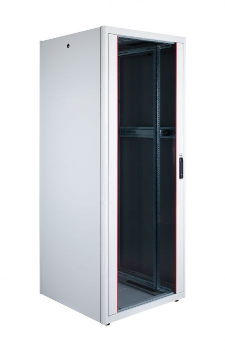 • These cabinets, of the Basic Flex Line, are engineered for the efficient and user-friendly installation of both active and passive network components, prioritizing streamlined cable management. Crafted from steel sheets up to 1.5 mm thick, every cabinet guarantees excellent stability, attributed to a unique plate curving technique, forming a sturdy steel framework. They are finished with a powder coating in shades of grey (RAL 7035) and black (RAL 9005). For challenging set-up locations that are less accessible, the cabinet is designed to be disassembled. The doors are easily detachable, and their stops can be switched between right and left orientations. Additionally, the roof is prepped for the integration of an air ventilation unit. Inside, each cabinet houses two sets (4 pieces) of 483 mm (19") profile rails. These rails, galvanized and marked with height units readable from both directions, are adjustable in depth. To facilitate extensive equipment installations, they're paired with supplementary depth support bars. Cable management is central to the design. The cabinet base features a punched-out cable entry shielded with a metal plate. For the broader 800 mm width cabinets, there are added punched-out cable entries covered with plastic on both sides. These entries are replicated on the roof, with a single one for 600 mm width cabinets and three for the 800 mm width ones. To cater to diverse operational needs, a wide assortment of accessories, including cable management tools and shelves, is readily available.