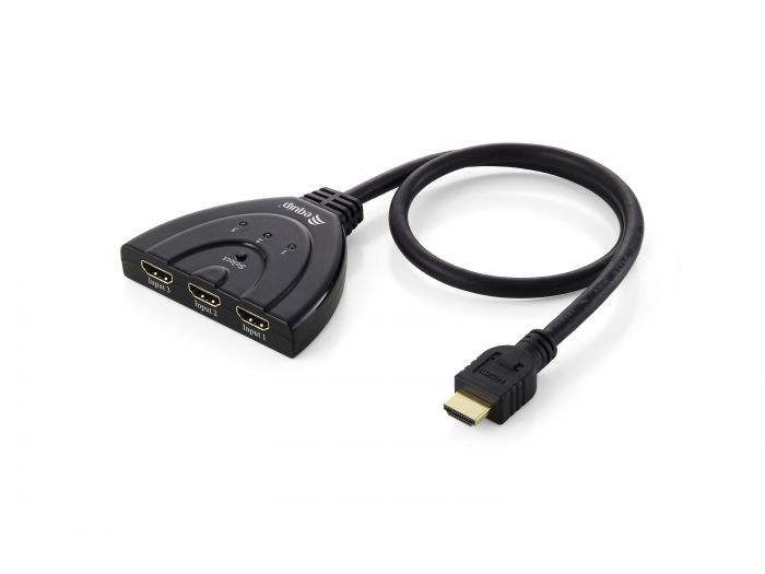 • The equip® 3-Port HDMI Switch comes with 3 HDMI input ports and 1 HDMI output port, allows users to connect up to 3 HDMI devices to a single HDTV display or projector. Features manual push button switch function, simple plug-and-play operation, no software or power supply requiRed.